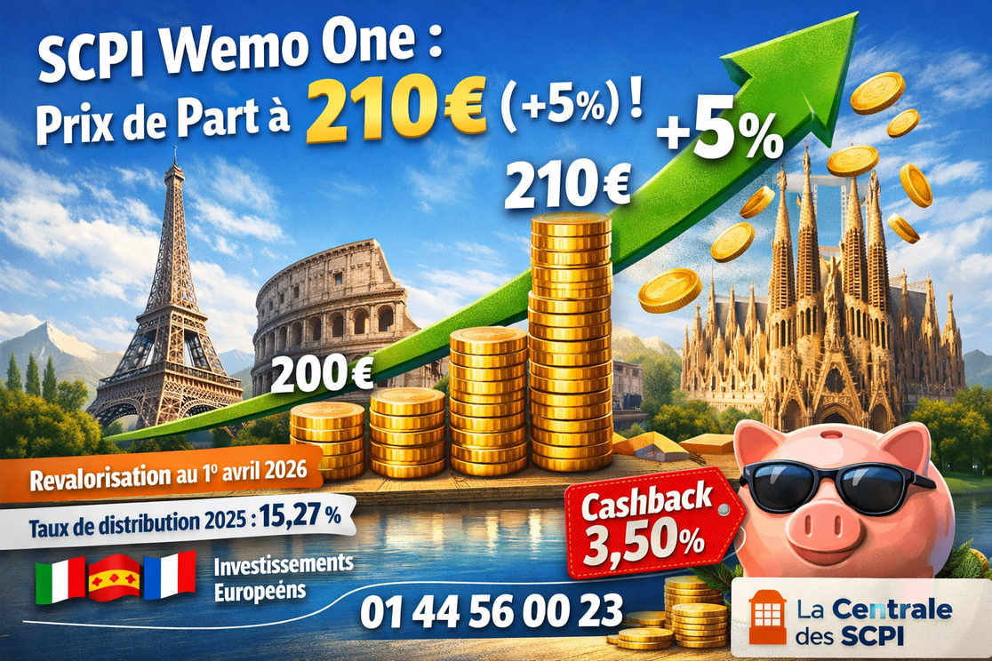 Excellente nouvelle pour les investisseurs : la SCPI Wemo One vient d'augmenter son prix de part de 200 € à 210 €, soit une revalorisation de +5 % au 1er avril 2026.
